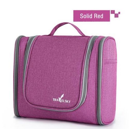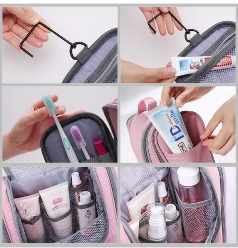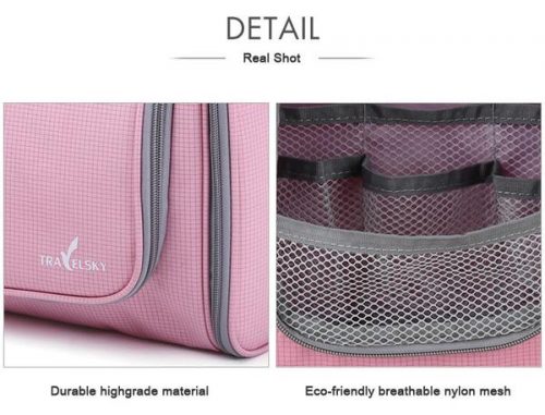 A nifty built-in hanger lets you hang the bag and be able to access your toiletries in an accessible manner.